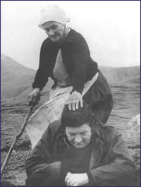 Visually the film is striking not only for its minimalist black & white photography but for its use of silent film under titles to translate the Gaelic dialogue. Long takes and long shots prevail, but unlike Poitin there is not a lot of camera movement, and Quinn's compositions are most often spare and high contrast. The film's pictorial grace and apparent artificiality, constantly reinforced by the intertitle cards, again brings the film into the realm of anti-illusionistic. Quinn this time is calling attention to the illusion itself, inviting his viewers to take pleasure in it but reminding them that this is only a movie (and a silent movie at that!). The minimalist editing and composition is certainly meant as a visual antecedent to the lives of the villagers, again an answer to the sugar coating that Hopllywood so often practises when photographing the Irish landscape. It is certainly ironic this revisionism is resurrected through the resurrection of classical film conventions, but the impulse to go back to a technologically primitive cinema aesthetic is yet another manifestation of Quinn's skepticism towards modernity, and a way of paying deference in representing a community still very much stuck in the past.